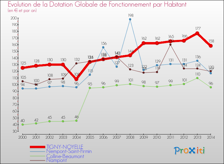 Dans le même temps, la Dotation Globale de Fonctionnement accordée aux communes françaises similaires à Tigny-Noyelle était de 226 € par habitant, en 2014.
