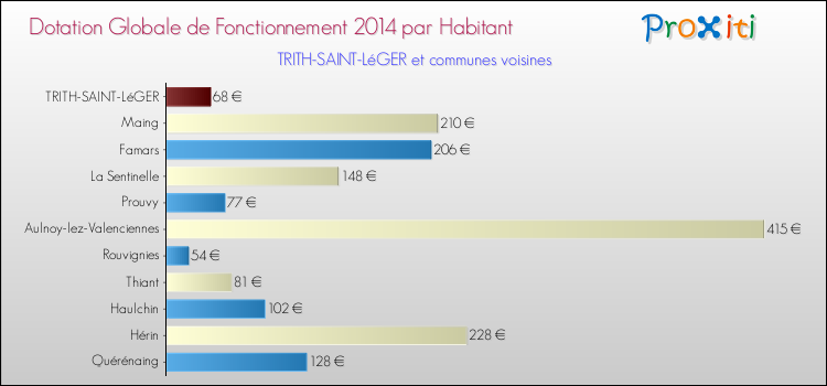 Le graphique ci dessous indique la Dotation Globale de Fonctionnement accordée par habitant à Trith-Saint-Léger en 2014 par rapport aux communes voisines.