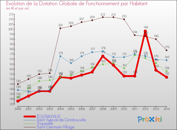Dans le même temps, la Dotation Globale de Fonctionnement accordée aux communes françaises similaires à Toutainville était de 216 € par habitant, en 2014.