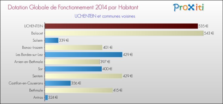 Le graphique ci dessous indique la Dotation Globale de Fonctionnement accordée par habitant à Uchentein en 2014 par rapport aux communes voisines.