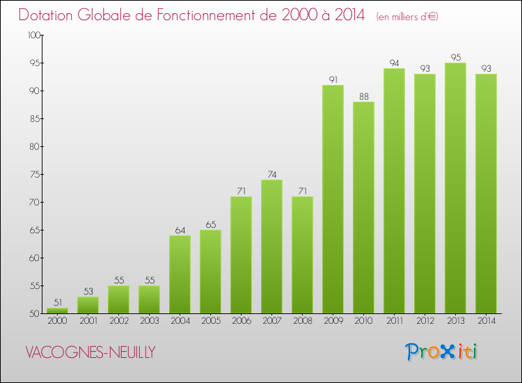 Dans le même temps, la Dotation Globale de Fonctionnement accordée aux communes françaises similaires à Vacognes-Neuilly était de 216 € par habitant, en 2014.