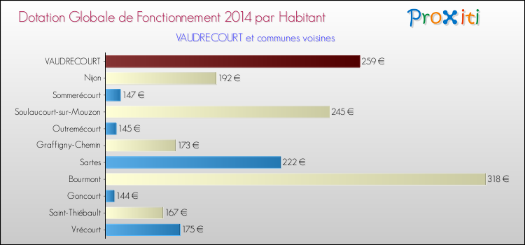 Le graphique ci dessous indique la Dotation Globale de Fonctionnement accordée par habitant à Vaudrecourt en 2014 par rapport aux communes voisines.