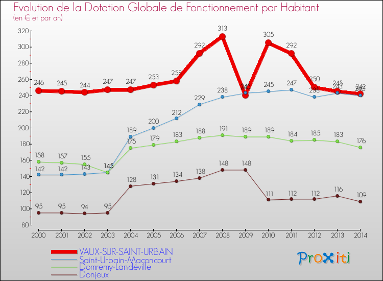 A Vaux-sur-Saint-Urbain, en 2014 un habitant reçoit donc plus de subventions au titre de la DGF que pour des communes similaires.