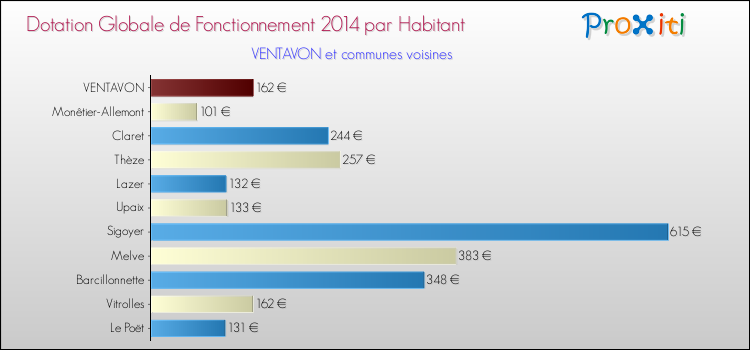 Le graphique ci dessous indique la Dotation Globale de Fonctionnement accordée par habitant à Ventavon en 2014 par rapport aux communes voisines.
