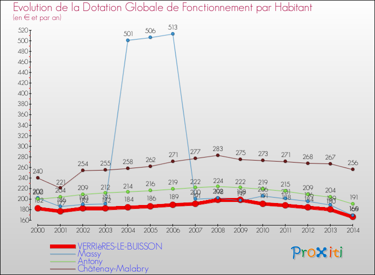 Dans le même temps, la Dotation Globale de Fonctionnement accordée aux communes françaises similaires à Verrières-le-Buisson était de 227 € par habitant, en 2014.