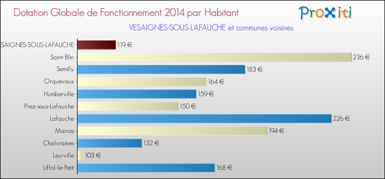 Le graphique ci dessous indique la Dotation Globale de Fonctionnement accordée par habitant à Vesaignes-sous-Lafauche en 2014 par rapport aux communes voisines.