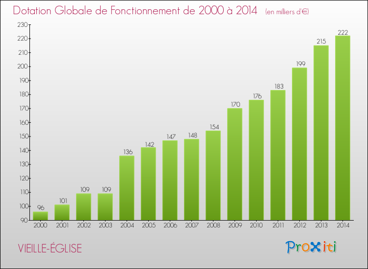 Dans le même temps, la Dotation Globale de Fonctionnement accordée aux communes françaises similaires à Vieille-Église était de 216 € par habitant, en 2014.
