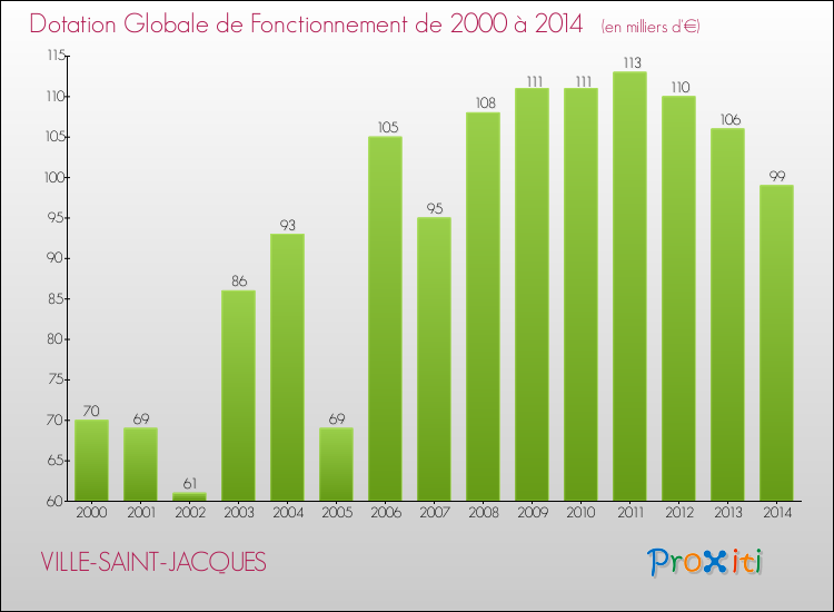 En effet, la dotation globale de fonctionnement versée par l'état en 2014 à la seule commune de Ville-Saint-Jacques était de : 99 000 € au total.