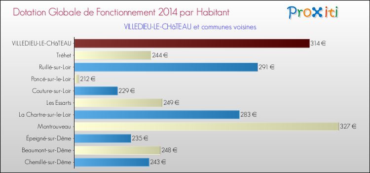 Le graphique ci dessous indique la Dotation Globale de Fonctionnement accordée par habitant à Villedieu-le-Château en 2014 par rapport aux communes voisines.