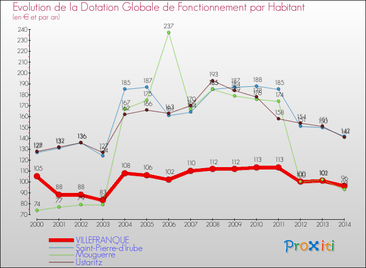 Dans le même temps, la Dotation Globale de Fonctionnement accordée aux communes françaises similaires à Villefranque était de 177 € par habitant, en 2014.