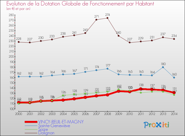 Comparaison des dotations globales de fonctionnement par habitant pour VINCY-REUIL-ET-MAGNY et les communes voisines de 2000 à 2014.