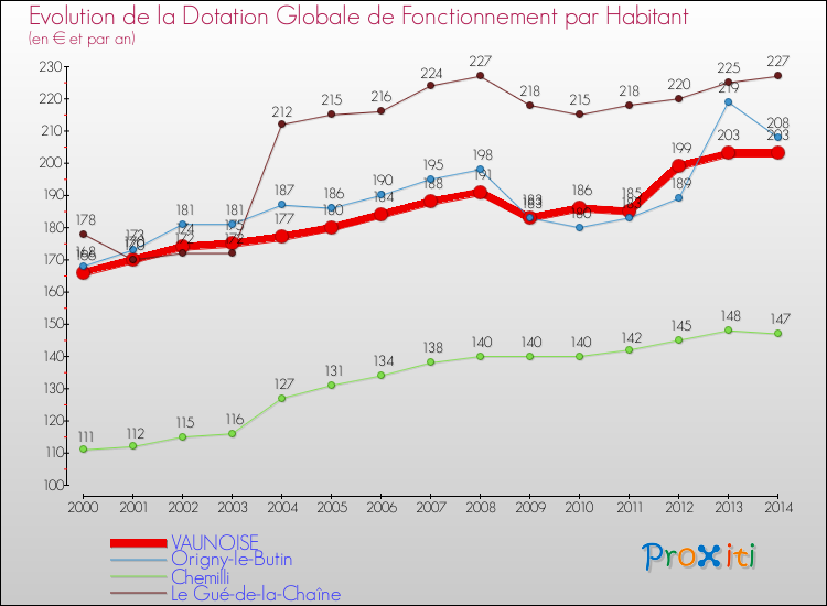 Dans le même temps, la Dotation Globale de Fonctionnement accordée aux communes françaises similaires à Vaunoise était de 230 € par habitant, en 2014.