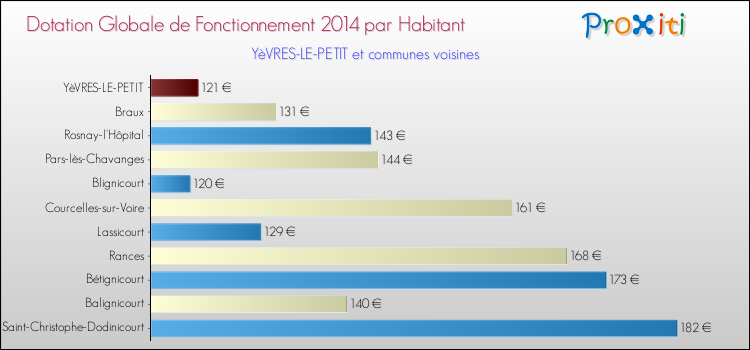 Le graphique ci dessous indique la Dotation Globale de Fonctionnement accordée par habitant à Yèvres-le-Petit en 2014 par rapport aux communes voisines.