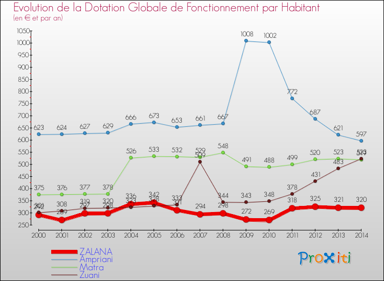 A Zalana, en 2014 un habitant reçoit donc plus de subventions au titre de la DGF que pour des communes similaires.