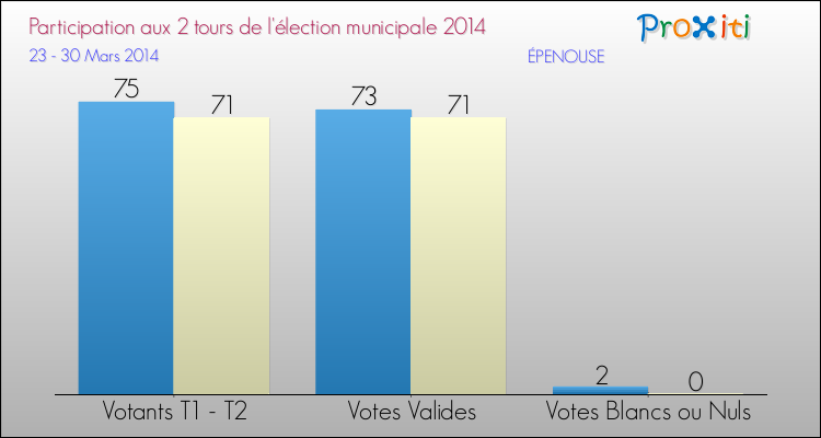 Le taux de participation à Épenouse est donc de 86.59% pour ce second tour et le taux d'abstention a donc été de 13.41%.