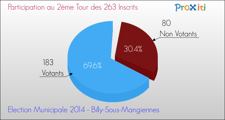 Le taux de participation à Billy-sous-Mangiennes est donc de 69.58% pour ce second tour et le taux d'abstention a donc été de 30.42%.