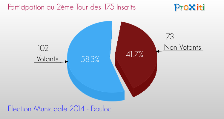 Le taux de participation à Bouloc est donc de 58.29% pour ce second tour et le taux d'abstention a donc été de 41.71%.