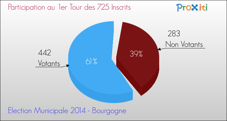 Le graphique ci dessous tient compte du choix de la totalité des 725 personnes inscrites à Bourgogne et donc capables de voter, et permet de relativiser le résultat de l'élection, car seuls 442 d'entre eux sont venus voter.