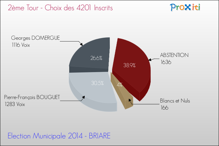 Le graphique ci dessous tient compte du choix de la totalité des 4201 personnes inscrites à Briare et donc capables de voter, et permet de relativiser le résultat de l'élection, car seuls 2565 d'entre eux sont venus voter.