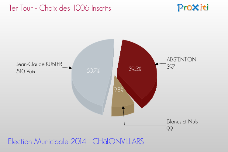 Le graphique ci dessous tient compte du choix de la totalité des 1006 personnes inscrites à Châlonvillars et donc capables de voter, et permet de relativiser le résultat de l'élection, car seuls 609 d'entre eux sont venus voter.