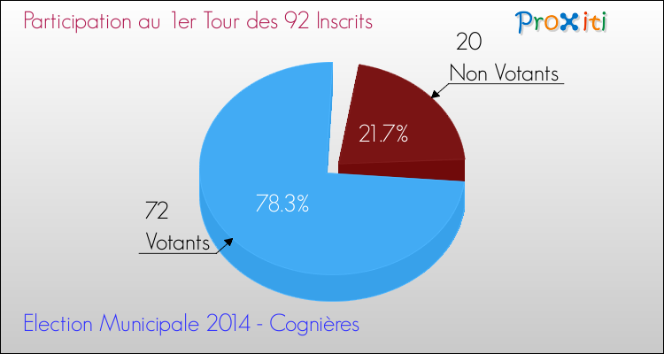 Le dimanche 23 mars dernier, pour le premier tour des élections municipales à Cognières, sur les 92 inscrits pouvant voter, 72 votants se sont déplacés pour choisir leurs prochains élus.