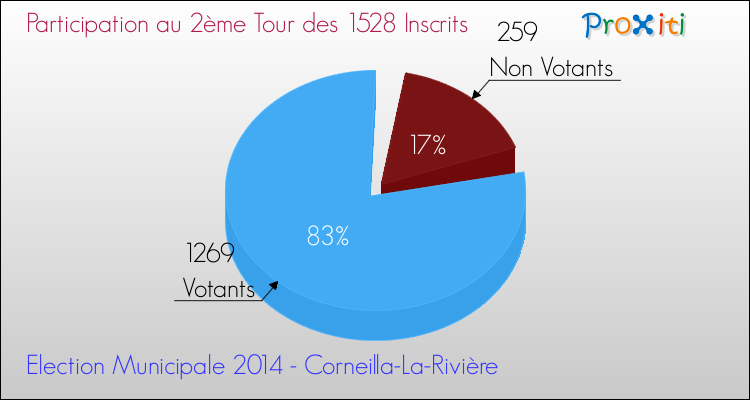 Le taux de participation à Corneilla-la-Rivière est donc de 83.05% pour ce second tour et le taux d'abstention a donc été de 16.95%.