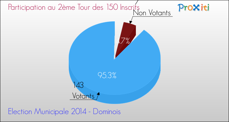Le taux de participation à Dominois est donc de 95.33% pour ce second tour et le taux d'abstention a donc été de 4.67%.