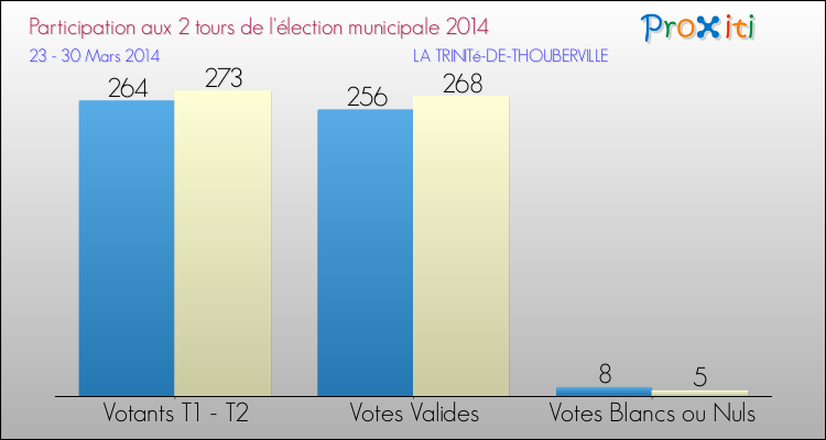 Le taux de participation à La Trinité-de-Thouberville est donc de 73.78% pour ce second tour et le taux d'abstention a donc été de 26.22%.