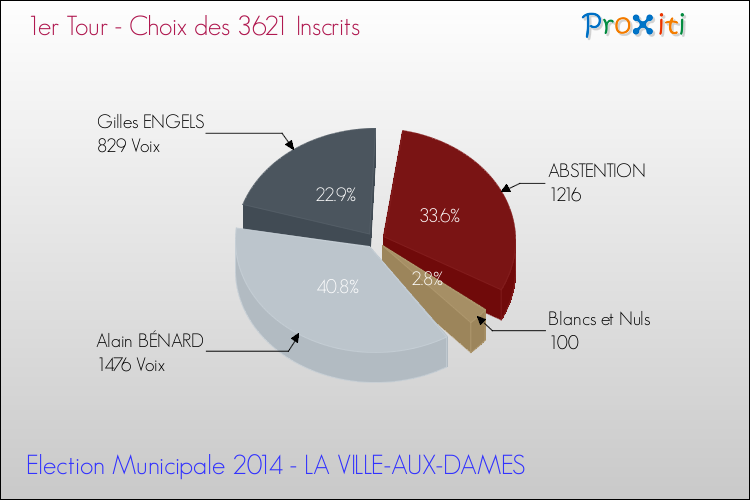 Le graphique ci dessous tient compte du choix de la totalité des 3621 personnes inscrites à La Ville-aux-Dames et donc capables de voter, et permet de relativiser le résultat de l'élection, car seuls 2405 d'entre eux sont venus voter.