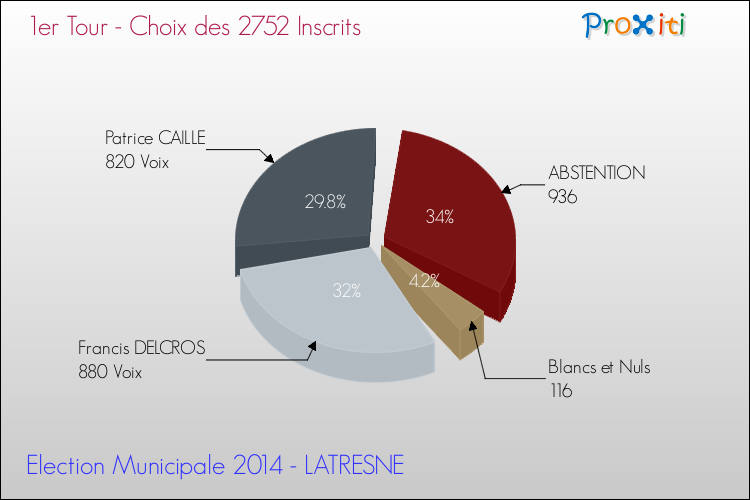 Le graphique ci dessous tient compte du choix de la totalité des 2752 personnes inscrites à Latresne et donc capables de voter, et permet de relativiser le résultat de l'élection, car seuls 1816 d'entre eux sont venus voter.