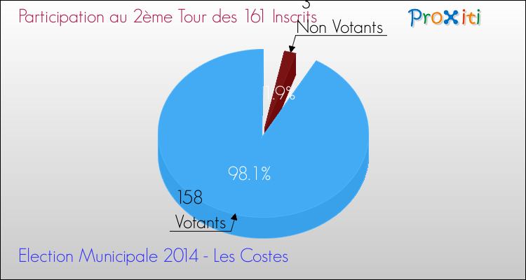 Le taux de participation à Les Costes est donc de 98.14% pour ce second tour et le taux d'abstention a donc été de 1.86%.