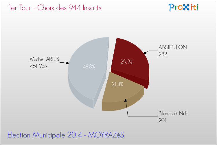 Le graphique ci dessous tient compte du choix de la totalité des 944 personnes inscrites à Moyrazès et donc capables de voter, et permet de relativiser le résultat de l'élection, car seuls 662 d'entre eux sont venus voter.