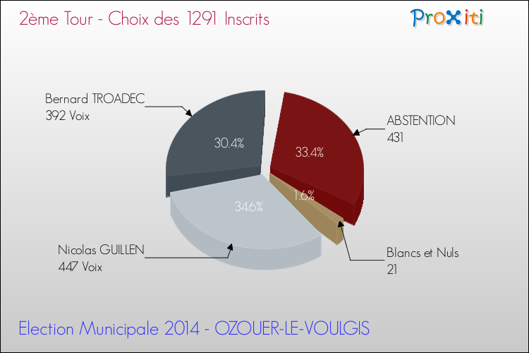 Le taux de participation à Ozouer-le-Voulgis est donc de 66.62% pour ce second tour et le taux d'abstention a donc été de 33.38%.