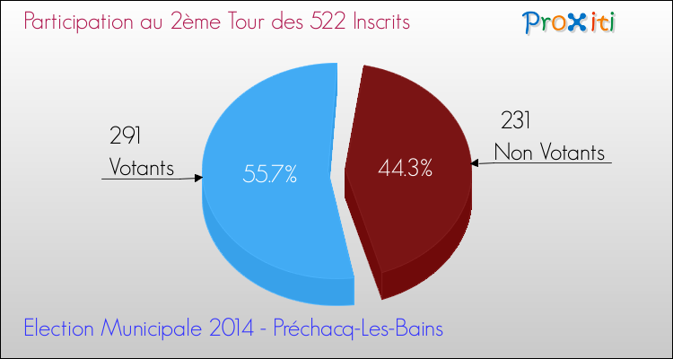 Le taux de participation à Préchacq-les-Bains est donc de 55.75% pour ce second tour et le taux d'abstention a donc été de 44.25%.