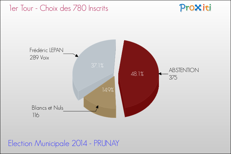 Le graphique ci dessous tient compte du choix de la totalité des 780 personnes inscrites à Prunay et donc capables de voter, et permet de relativiser le résultat de l'élection, car seuls 405 d'entre eux sont venus voter.