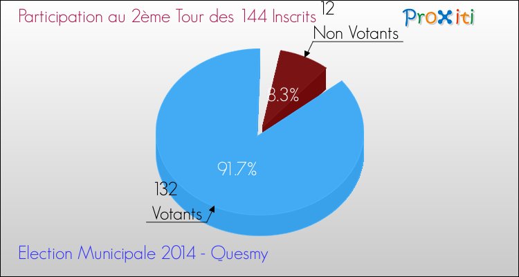 Le taux de participation à Quesmy est donc de 91.67% pour ce second tour et le taux d'abstention a donc été de 8.33%.
