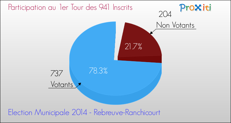 Le graphique ci dessous tient compte du choix de la totalité des 941 personnes inscrites à Rebreuve-Ranchicourt et donc capables de voter, et permet de relativiser le résultat de l'élection, car seuls 737 d'entre eux sont venus voter.