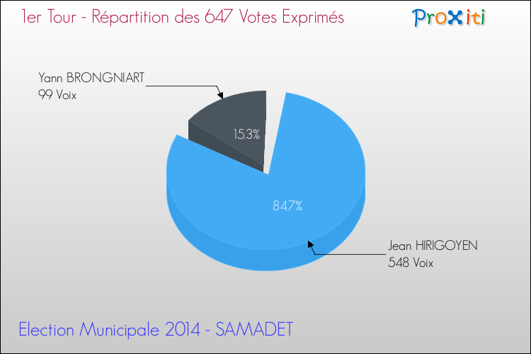 Le graphique ci dessous tient compte du choix de la totalité des 868 personnes inscrites à Samadet et donc capables de voter, et permet de relativiser le résultat de l'élection, car seuls 707 d'entre eux sont venus voter.