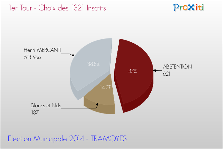 Le graphique ci dessous tient compte du choix de la totalité des 1321 personnes inscrites à Tramoyes et donc capables de voter, et permet de relativiser le résultat de l'élection, car seuls 700 d'entre eux sont venus voter.