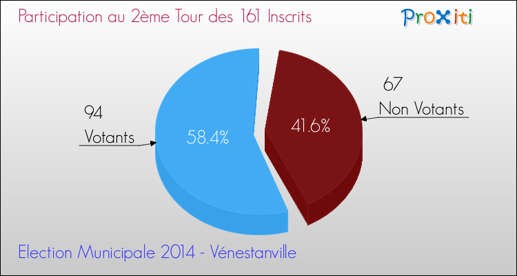 Le taux de participation à Vénestanville est donc de 58.39% pour ce second tour et le taux d'abstention a donc été de 41.61%.