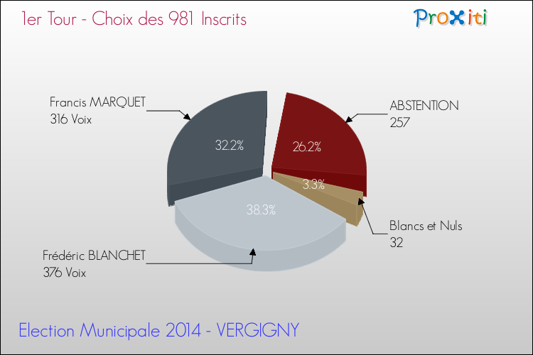 Le graphique ci dessous tient compte du choix de la totalité des 981 personnes inscrites à Vergigny et donc capables de voter, et permet de relativiser le résultat de l'élection, car seuls 724 d'entre eux sont venus voter.