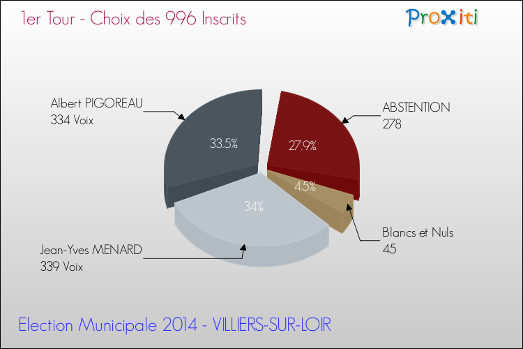 Le graphique ci dessous tient compte du choix de la totalité des 996 personnes inscrites à Villiers-sur-Loir et donc capables de voter, et permet de relativiser le résultat de l'élection, car seuls 718 d'entre eux sont venus voter.