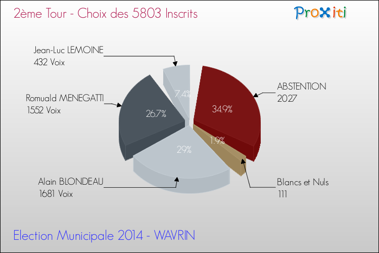 Le graphique ci dessous tient compte du choix de la totalité des 5803 personnes inscrites à Wavrin et donc capables de voter, et permet de relativiser le résultat de l'élection, car seuls 3776 d'entre eux sont venus voter.