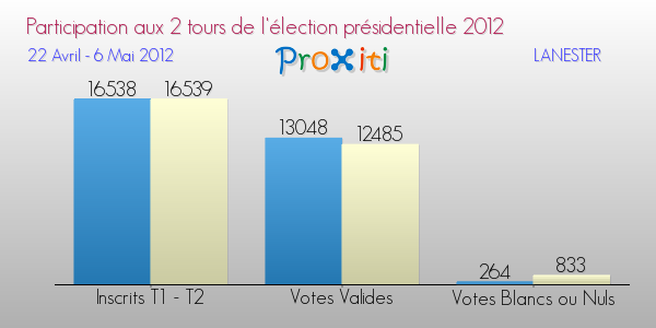 Sur 16538 personnes inscrites au 1er tour à Lanester, 13312 se sont déplacées pour mettre leur bulletin dans l'urne, et 3226 ne sont pas venues voter.