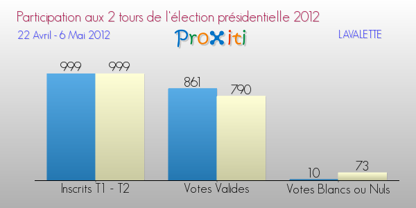 Sur 999 personnes inscrites au 1er tour à Lavalette, 871 se sont déplacées pour mettre leur bulletin dans l'urne, et 128 ne sont pas venues voter.