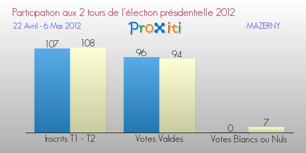Sur 107 personnes inscrites au 1er tour à Mazerny, 96 se sont déplacées pour mettre leur bulletin dans l'urne, et 11 ne sont pas venues voter.