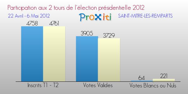 Sur 4758 personnes inscrites au 1er tour à Saint-Mitre-les-Remparts, 3969 se sont déplacées pour mettre leur bulletin dans l'urne, et 789 ne sont pas venues voter.