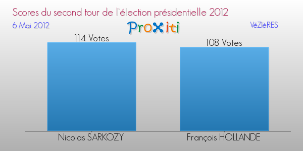 ![]() François HOLLANDE![]() Parti socialiste Vienne : 55.31% France Entière : 51.63% | 108 Voix | 48.65% |