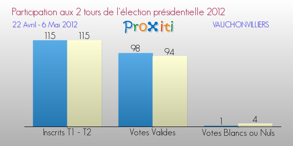 Sur 115 personnes inscrites au 1er tour à Vauchonvilliers, 99 se sont déplacées pour mettre leur bulletin dans l'urne, et 16 ne sont pas venues voter.