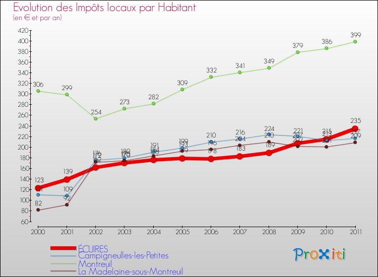 A Écuires, les impôts locaux par habitant ont donc augmentés de 91.06 % entre 2000 et 2011.